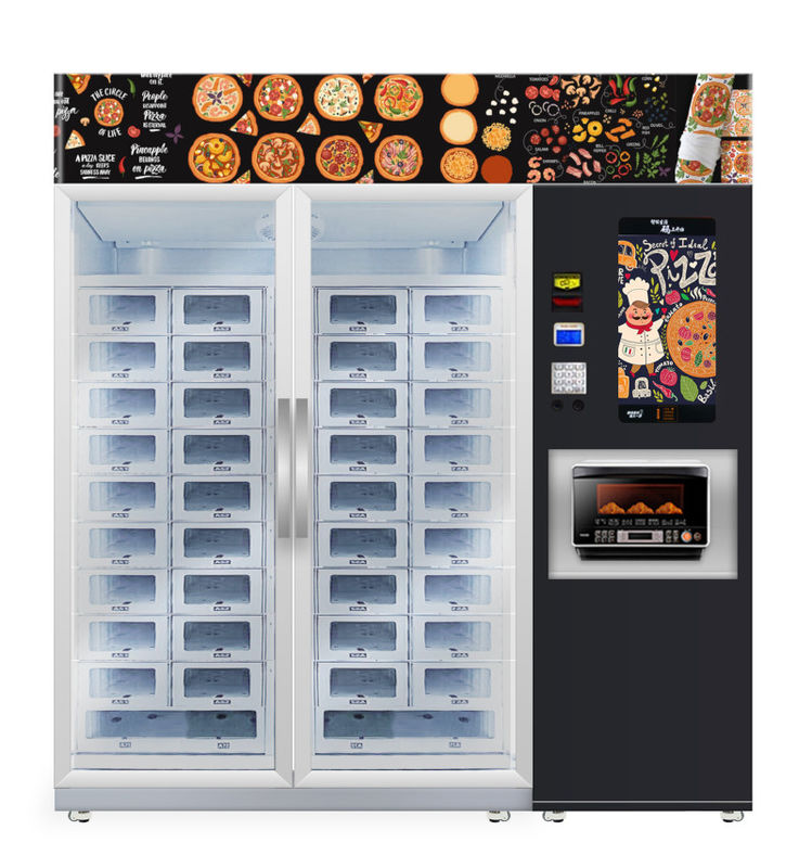 Máy bán pizza có lò vi sóng, máy bán hàng dạng tủ. Khách hàng có thể lấy pizza từ tủ lạnh và hâm nóng trong lò vi sóng.